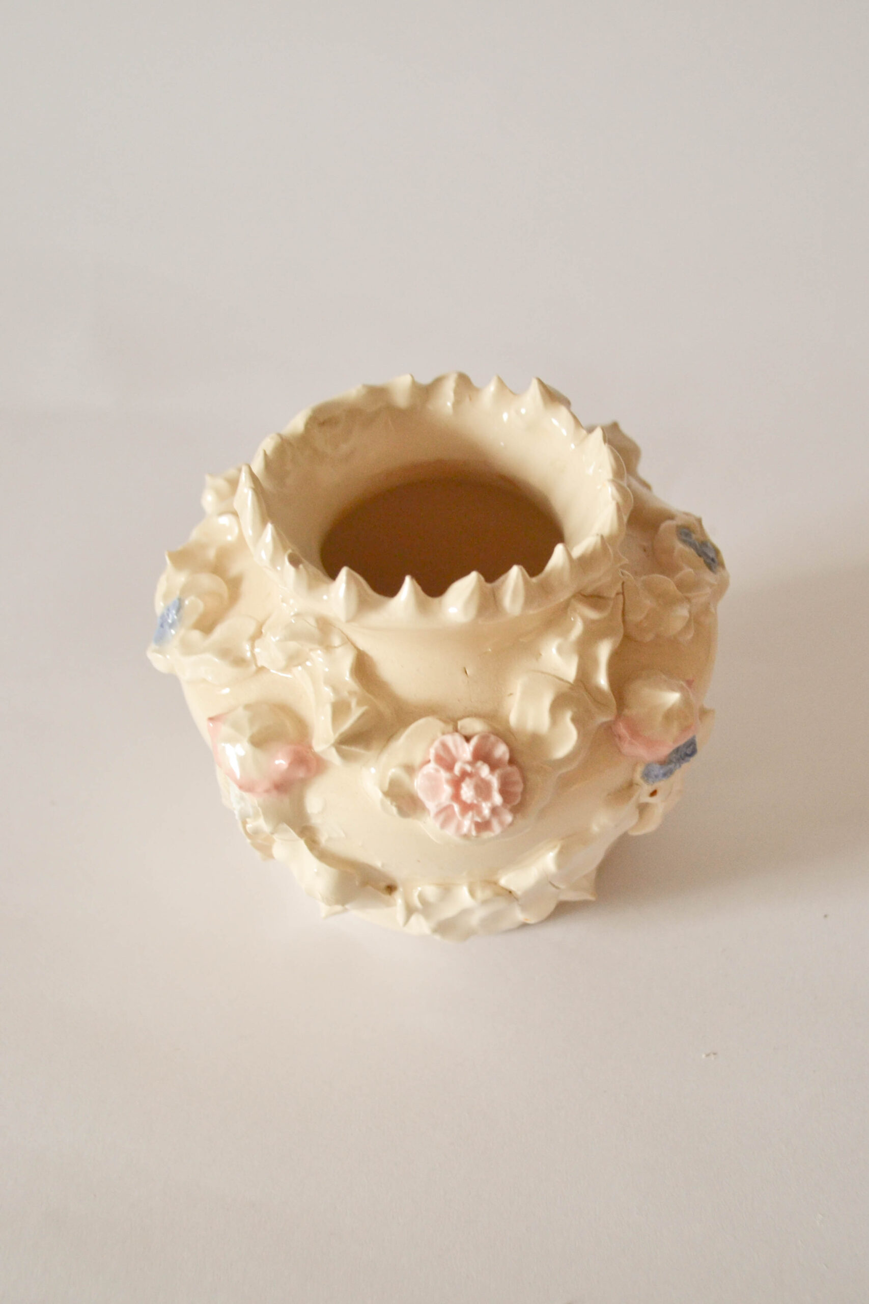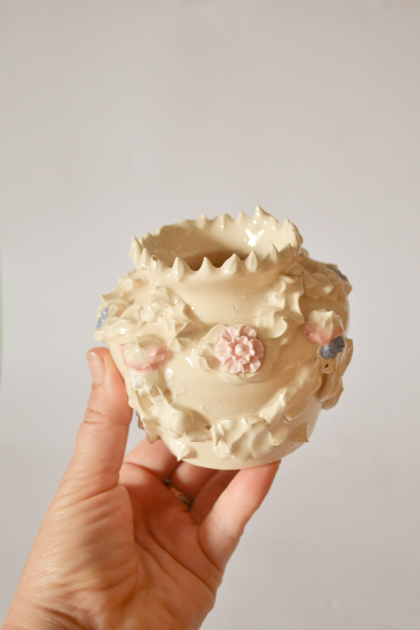 Están todos hechos en torno, son únicos y están decorados con manga de repostero para darle este acabado original.